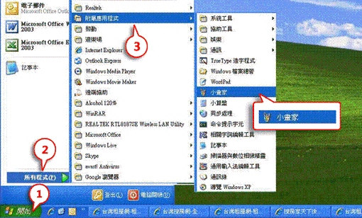 一、打開小畫家,從左下角【開始】->【所有程式】->【附屬應用程式】->【小畫家】: