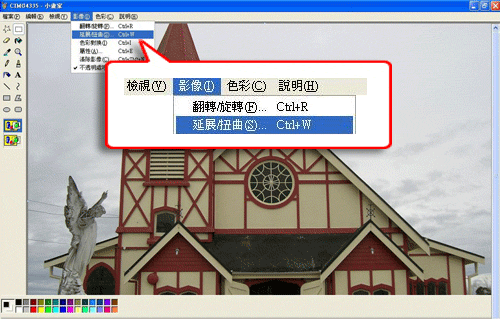 四、圖檔打開後,點上方【影像】-> 選擇【延展/扭曲】: