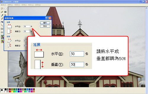 五、出來一個小視窗,直接修改水平及垂直的百分比例 (建議縮小到50%),水平及垂直要填相同的數字以免圖片變形,然後按【確定】: