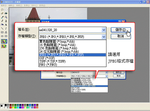 七、填上你要的檔名後,在【存檔類型】的地方選擇"JPEG"的格式,按下【儲存】後就完成了: